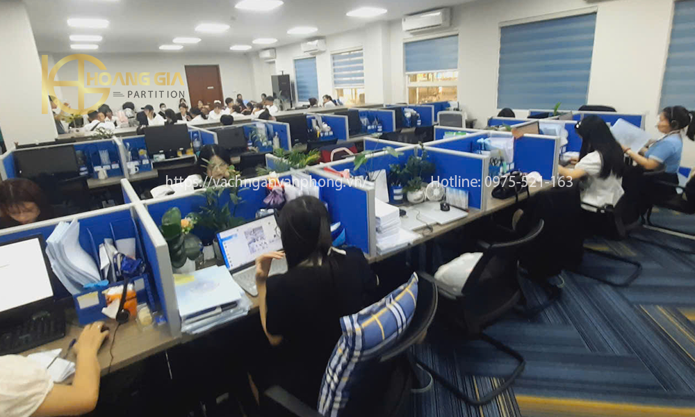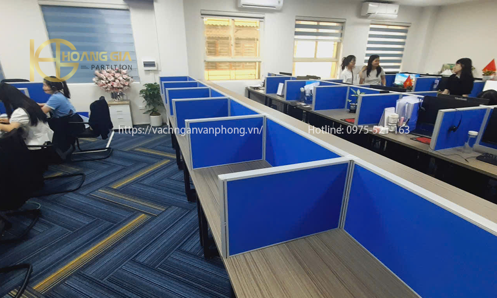 Vách ngăn bàn làm việc nỉ khung nhôm màu xanh được làm từ gỗ MDF bọc vải nỉ bên ngoài có khả năng cách âm giảm tiếng ồn tốt, khung nhôm định hình lắp ghép thông mình giúp liên kết các tấm vách rời với nhau một cách nhanh chóng.