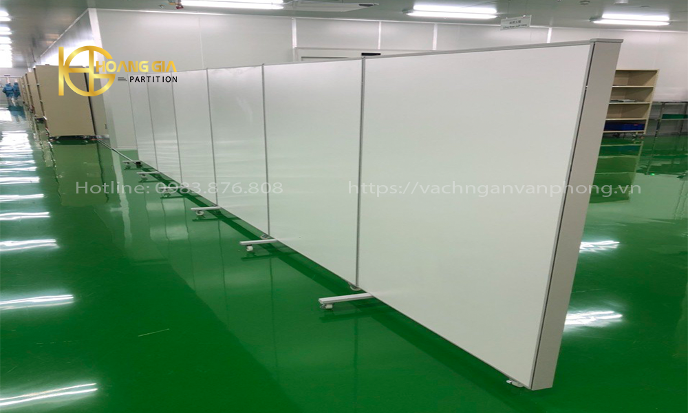Vách ngăn gỗ Melamine chống ẩm, chống trầy xước, khung bao quanh bằng nhôm định hình, phía dưới có bánh xe di chuyển nhẹ nhàng, có khoá bánh.